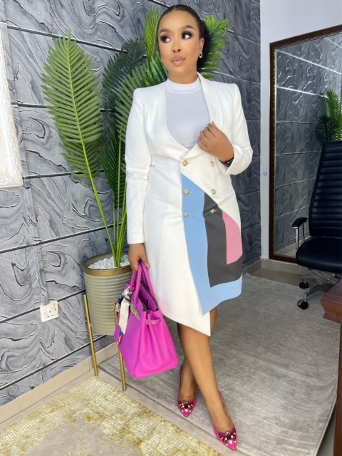 SINGLE SIDE MIXED COLOUR BLAZER DRESS WITH SLEEVELESS TURTLE NECK INNER.